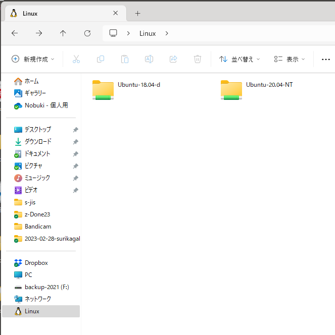 下図(エクスプローラ画面)の Ubuntu-20.04-NT (実習システムでは Ubuntu-20.04-k) の中の